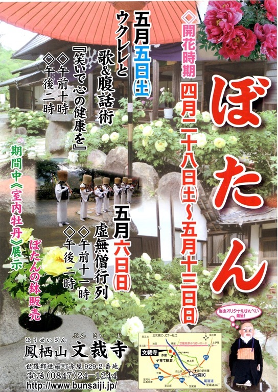 ぼたんまつり 2018年4月11日 最終更新日時 : 2025年3月30日 kazikeda 開花時期4月下旬~5月中旬ごろまでイベント5月5日(土)『笑いで心の健康を』と題して住職によるウクレレと歌と、腹話術を行います。5月6日(日)は虚無僧行列を行います。 境内牡丹観賞は無料ですので、是非お越し下さい。 \ 最新情報をチェック /